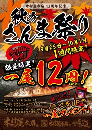 それに併せまして「木村屋本店」ではこの度、お客様への日ごろの感謝を込め、9月25日(月)~10月1日(日)までの1週間限定で「秋のさんま祭り」と題した12周年キャンペーンを開催。