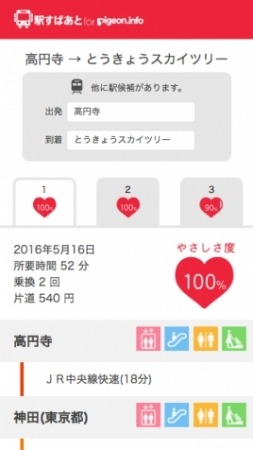 お子さま連れやベビーカーを利用して電車移動をする方にとっての最適経路として、乗り換え回数が少ない・乗り換え時にエレベーターなどが利用できる・多目的トイレがある駅を経由するなどを考慮した「やさしい経路」を優先的に案内し、経路の「やさしさ度」や駅の設備情報を表示することで、お出かけを支援しています。