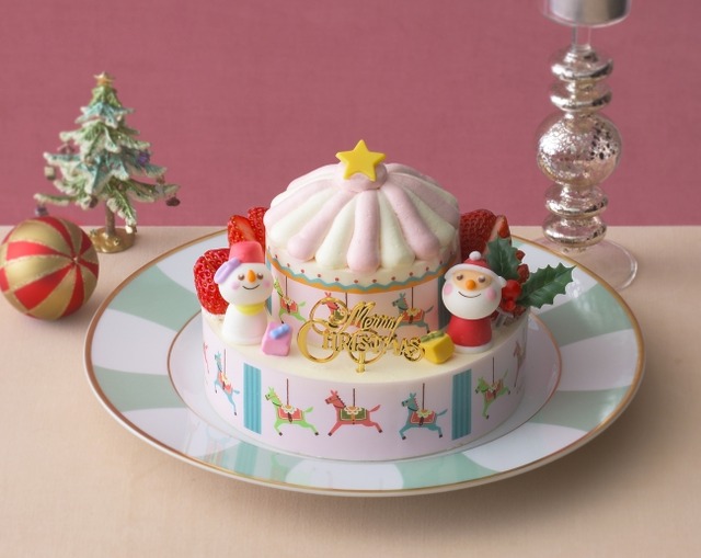 目玉となるスペシャリテは、きらめきながら回るメリーゴーランドをイメージした2段重ねのデコレーションケーキ「ハッピーメリーゴーランド」。デザインの楽しさはもちろん、苺クリームのほんのり甘酸っぱさと、ホワイトチョコムース&練乳クリームのほどよい甘みがとけ合うやさしい味わいにもこだわった、パーティーにおすすめの一品です。