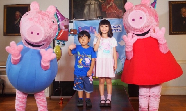 「Peppa Pig」のメインキャラクターであるペッパ役とジョージ役の日本語吹き替えの声を担当する、青山ららちゃん、鈴木楽くんがお揃いのアパレルを着て登場し、日本で10月10日(火)から放送を予定している4つのエピソードを鑑賞しました。試写の後、ペッパピッグとジョージピッグのキャラクターが日本初上陸をお祝いするため、会場にサプライズ登場しました。青山ららちゃんと鈴木楽くんは、自身が担当した日本語吹き替え版の完成試写の感想を述べました。青山ららちゃんは演技が難しかったところは、「ペッパがお母さんの真似をして、クマのお人形を叱るところ」と話し、鈴木楽くんはジョージ役の練習を自宅で兄の鈴木福くんと一緒にがんばったと話しました。最後に二人がキャラクターの鼻を鳴らす真似をし、会場を沸かせました。