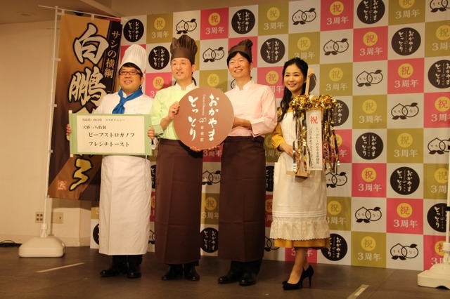 岡山県と鳥取県の共同アンテナショップ「とっとり・おかやま新橋館」では、3周年を記念したスペシャルメニュー発表会を開催しました。芸能界きっての料理上手として知られる人気お笑いコンビ「キャイ~ン」の天野ひろゆきさんが両県自慢の食材を使ってスペシャルメニューを考案。両県知事が仕上げを行いました。お披露目には同じ事務所の関根麻里さんが応援にかけつけてくれました。10月3日から鳥取牛と岡山「千屋牛」を使ったスペシャルメニュー「ビーフストロガノフ」を2週間ごとに交互に提供します。