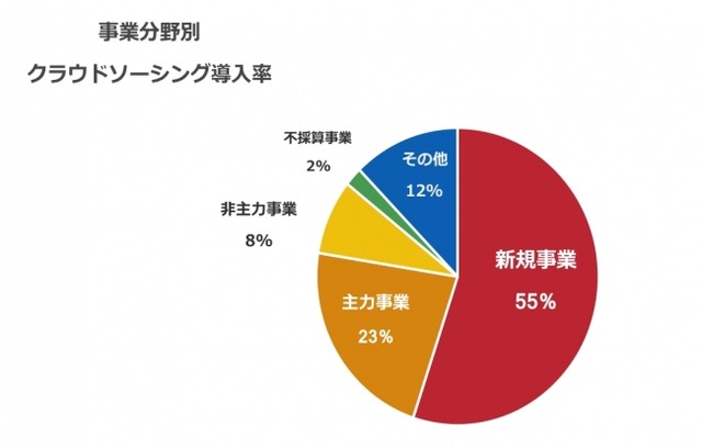 クラウドソーシングを導入した事業分野は、新規事業が54%と最も多く、次いで主力事業が22%となっており、積極的な企業活動の中で活用されていることがわかります。