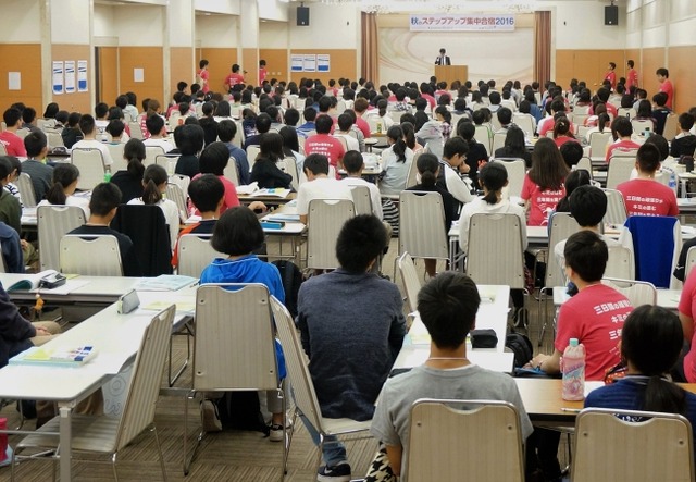 高校受験を控えた同学年の生徒たちが集まり、5教科すべての弱点克服と入試実戦演習による学力向上を目的に、徹底的に勉強漬けの3日間を過ごす「2017秋の集中合宿」。昨年は647名もの生徒が参加し、今年も同規模イベントを予定しています。指導するのは「個別指導学院フリーステップ」「ハイグレード個人指導ソフィア」の『個別指導』を専門に行う講師たち。600名を超える生徒の指導のために、講師たちも関西圏からこの会場に集結します。全国でもあまり例のない、この大規模合宿は今年で15回目を迎え、成学社の「秋の恒例行事」となっています。昨年の参加者の中には、合宿後のテストで「5教科477点獲得」した生徒や、合宿前のテストと比較して「5教科301点の点数上昇」を達成した生徒もおり、集中的な勉強によって即効果が出ている声を多数頂いています。