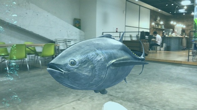 特長は、「ARKit」の空間認識技術、特に平面認識技術を活かし、ユーザがスマートフォンで360度どこをかざしても魚類を楽しむことができる点。ユーザの横を魚がすり抜けて泳いで行ったり、上部からいきなり巨大な魚が迫ってきたり、まるで自分が海の中にいるかのような体験を味わうことができます。
