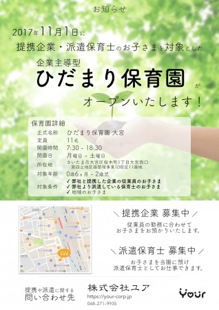 株式会社ユア(本社:東京都足立区 代表取締役社長:渡邉佑太 URL:https://your-corp.jp/、以下ユア)は、企業主導型保育事業(内閣府)助成金の認定を受け、派遣保育士のお子さまをお預かりする保育園「ひだまり保育園 大宮」( https://your-corp.jp/places/hidamari )を、2017年11月1日(水)さいたま市大宮区にオープンいたします。