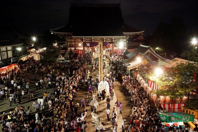 「日蓮聖人入滅の地」である池上本門寺では、命日の10月13日に合わせ、10月11日から13日の3日間、「お会式」が盛大に行われ、毎年全国から約30万人もの人出で賑わいます。最大の見どころは、12日の18:00頃より東急池上線池上駅周辺から本門寺境内までの約2キロにわたって行われる万灯練供養。桜の花で飾った万灯を持った約100団体、総勢3,000人もの万灯練行列が池上の町を深夜まで練り歩きます。