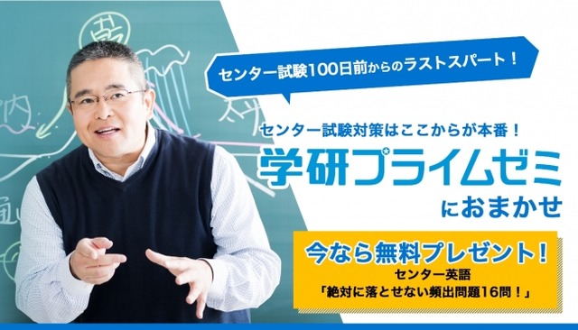 株式会社 学研ホールディングス(東京・品川/代表取締役社長:宮原博昭)のグループ会社、株式会社学研プラス(東京・品川/代表取締役社長:碇 秀行)は、実力講師によるハイレベル映像授業「学研プライムゼミ」の公式サイトで、毎年50万人以上が受験するセンター試験受験者のためにオリジナルプリント「絶対に落とせない英語頻出16問」を無料公開します。全センター試験の英語文法問題から頻出問題をテーマ別に厳選しています。
