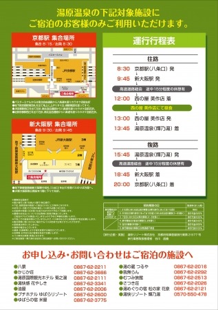 バス発着場所・運行行程表・湯原温泉の近隣宿泊施設等掲載 チラシ画像