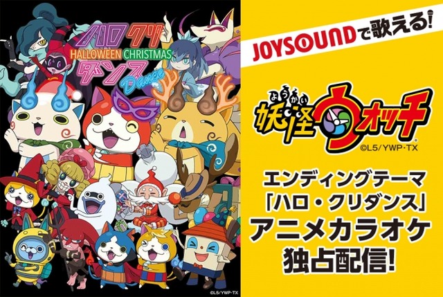 テレビ東京系6局ネットで毎週金曜夕方6時25分に放送中の人気アニメ「妖怪ウォッチ」。カラオケJOYSOUNDでは、本作のエンディングテーマで妖ベックス連合軍が歌う「ハロ・クリダンス」を、本作品のアニメ映像を背景にカラオケが楽しめるアニメカラオケとして、10月14日(土)よりカラオケ配信をスタートします。
