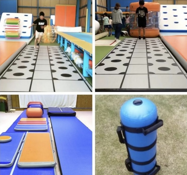 エアーマットは、空気の入ったトランポリンのように跳ねるマットで、金具がないことや空気を抜き、折りたたんで収納できることから、子供達にも安心して使えるマットとして各種スポーツ施設や学校などに導入されているマットです。