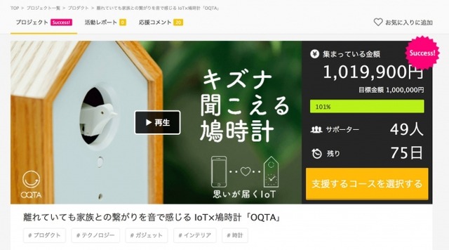 OQTA株式会社は、10月13日よりクラウドファンディングサイト「Makuake」にて、離れていても家族や大切な人との繋がりを音で感じるIoT×鳩時計「OQTA Clock」の先行予約販売を開始し、初日で、目標金額1,000,000円を達成しました。