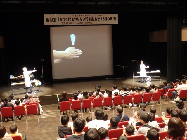 今年7都市目の開催となる「ワオ!スーパーサイエンスショー」は、当社が40年にわたる教育事業で培ったノウハウを凝縮した内容で、子どもたちが科学を身近に感じ、楽しめるイベントとして全国で人気を博しています。当日は、約150名の小学生(1~6年生)とその保護者が参加。子どもたちは、コマはなぜ回ると立つのか、自転車はなぜこがないと倒れるのか、など“回転(かいてん)”の不思議を学びました。