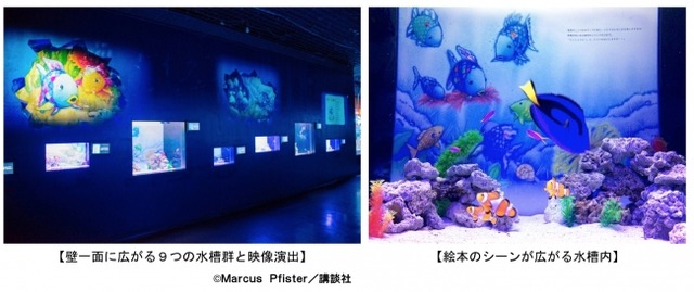 水槽内には<シリーズ全8冊の絵本のそれぞれの名シーン>をバックパネルに、その中に登場するキャラクターをイメージした「ルリスズメダイ」や「カクレクマノミ」、「ナンヨウハギ」などの魚たちを展示します。