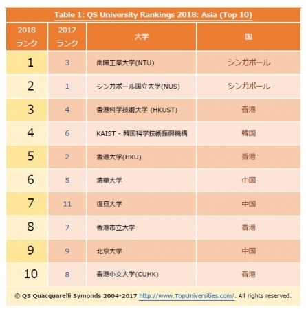 Table 1: QS University Rankings 2018: Asia (Top 10)