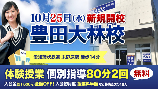 開校を記念し、特典をご用意しました。見学・学習相談は、いつでも承っておりますので、ぜひこの機会に「個別指導Axis豊田大林校」をご利用ください。