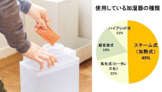 図:Q.使用している加湿器の種類? A.スチーム式(加熱式):49% 気化式(ヒータレス化):21% 超音波式:19% ハイブリッド式:11%(SA,n=678)