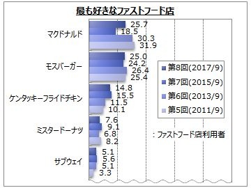 最も好きなファストフード店は、「マクドナルド」「モスバーガー」が利用者の3割弱、「ケンタッキーフライドチキン」が1割強です。「マクドナルド」は、いったん減少した2015年より増加しています。男性と女性20代では「マクドナルド」が1位、女性30代以上では「モスバーガー」が1位です。主利用店が最も好きだという人は、『モスバーガー』主利用者が8割強、『ケンタッキーフライドチキン』『サブウェイ』主利用者が各7割強と他の層より高くなっています。