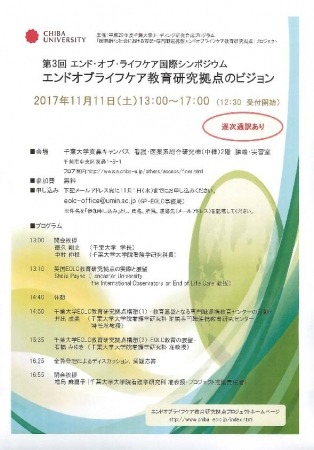 千葉大学ではこれまで、エンドオブライフケア教育研究拠点プロジェクトにおいて、生活と医療を統合した観点での研究発信、市民の方と協働で創り上げるプログラム開発などを行ってきました。本シンポジウムでは、英国において実際にエンドオブライフケア教育研究拠点を展開している看護学研究者を招聘し、千葉大学におけるエンドオブライフケア教育研究拠点構想を踏まえたディスカッションを通して、エンドオブライフケア教育研究拠点のビジョンを明確にすることを目的としています。(日英逐次通訳付)