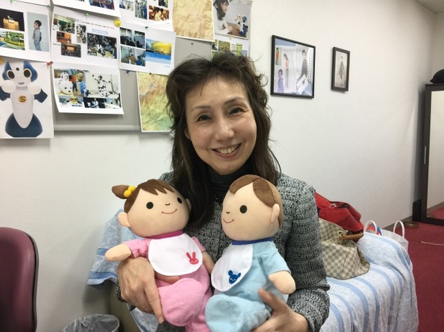 「こんにちは赤ちゃん」は、赤ちゃん型のぬいぐるみで、シンプルな加速度センサーと音声センサーを併せ持つ、成長機能を有した、優しいコミュニケーションロボットです。お母さんが1歳の赤ちゃんをあやす様に、「こんにちは赤ちゃん」をあやす事で、1歳児の言葉をしゃべります。繰り返しあやすと、ある時、1歳6カ月に成長した言葉になります。また、ややこしい初期設定は無く、電池を入れスイッチを入れただけで、起動します。そして、電池モジュールを取り外すと、ぬいぐるみ本体を洗えます。