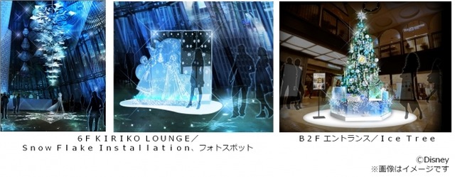 館内をエルサの魔法にかかったような美しい氷の結晶で彩り、映画の世界観を演出。6階「KIRIKO LOUNGE」の天井高約27mの大吹き抜けに、エルサの魔法をイメージしたインスタレーションによる、雪の結晶が舞うような幻想的な空間が登場します。