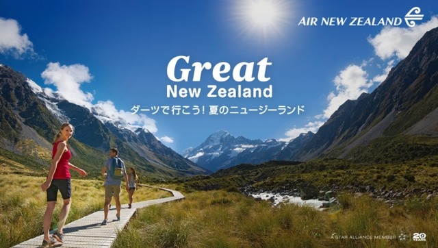 また、現在ニュージーランド航空では、皆様を夏のニュージーランドへいざなうキャンペーン、「Great New Zealand Sale - 夏のニュージーランドはすごいらしい。」を同時展開中です。キャンペーン・ウェブサイトでニュージーランド各地やアクティビティを紹介しつつ、羽田・成田・関西各空港からオークランドへの直行便を特別価格でご提供しています。キャンペーン価格は、羽田・成田・関西-オークランド便のエコノミークラス往復が諸税込み89,000円から、さらに日本の各空港からの乗り継ぎ料金も一律10,000円でご提供します*1。詳細は以下のページでご確認いただけます。