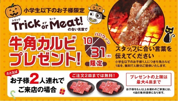 概要:合言葉「Trick or Meat」を伝えると、牛角カルビ(通常価格:590円(税抜))をお子様の人数分(※4名様まで)プレゼント。