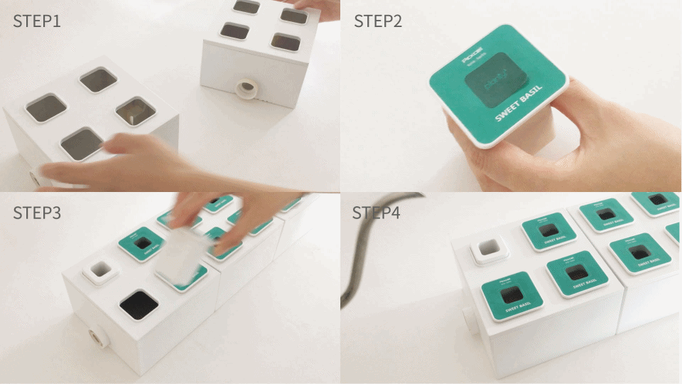 PLANTY SQAUREは水耕栽培を手軽に始められるように、種と必要な養分は「ピクセル」にセットされています。各種ピクセルの種は成長に必要な養分を含んだスポンジに入っており、殺虫剤や除草剤を利用せず、育てる事ができます。
