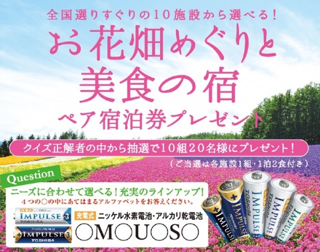 東芝ライフスタイル株式会社は、11月11日「電池の日」~12月12日「バッテリーの日」の『電池月間』にちなみ、2017年11月1日~2018年1月31日までの間、全国選りすぐりの10施設の中から選べる「お花畑めぐりと美食の宿」ペア宿泊券を10組20名様にプレゼントするキャンペーンを実施します。当キャンペーンを通じて、電池についての正しい使い方、安全な使い方などを見直していただくきっかけとなればと、どなたでも参加いただける東芝電池に関するクイズ形式のキャンペーンとしています。