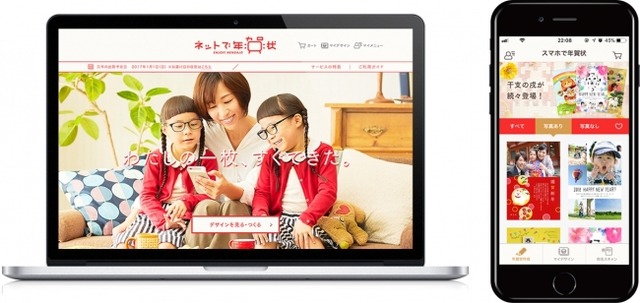 2010年よりサービスの提供を開始し、2013年11月からはスマートフォンアプリ版「スマホで年賀状」の提供を開始いたしました。2010年には約40億枚の流通枚数を誇った年賀状も、2017年度は約28.5億枚と約30%減少している中、当サービスは注文枚数が約221%増加(昨年対比2016-2017)し、累計注文枚数は1,700万枚を突破。