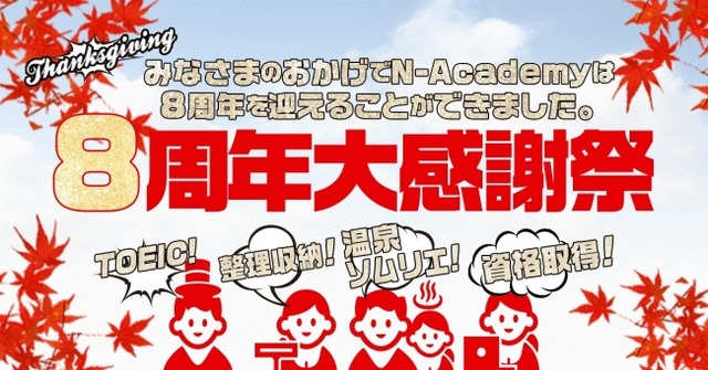 N-Academyは、11月4日をもちまして、8周年目を迎えます。こうして8周年が迎えられましたのは、皆様のお陰と深く感謝しております。日ごろの感謝の気持ちを込めまして、『8周年記念大感謝祭キャンペーン』を開催いたします。