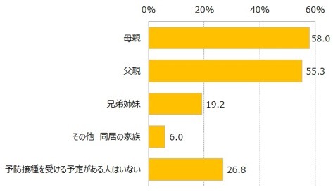 今シーズン(2017年-2018年)、いちばん上のお子さん以外で、インフルエンザの予防接種を受ける予定があるご家族についてお聞きしたところ、「母親」が58%で、「父親」が55.3%でした。いちばん上のお子さんが予防接種を受けるかどうかで分けてみてみると、お子さんが接種する予定の場合、母親の接種率は79.6%、お子さんが接種しない予定の場合、母親の接種率は21.6%と、差がはっきり出ました。父親や兄弟姉妹の接種率についても、同様の傾向がみられました。