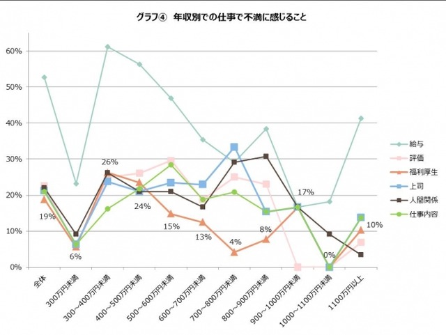 「現在の仕事で不満に感じること」について個人年収別に見ると、「福利厚生」と回答した人は、「300~400万円」が26%、「400~500万円」が24%と上位になりました。…グラフ4.