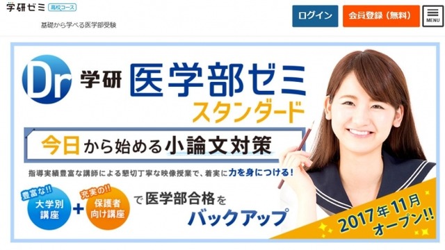 株式会社 学研ホールディングス(東京・品川/代表取締役社長:宮原博昭)のグループ会社、株式会社 学研プラス(東京・品川/代表取締役社長:碇 秀行)は、オンライン映像授業「学研医学部ゼミ スタンダード」を、2017年11月1日に個人向けに配信スタートします。