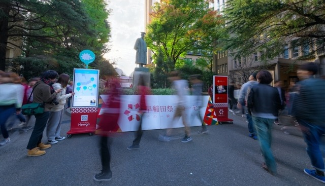 早稲田祭は、例年18万人を越える来場者が集まる日本最大級の学園祭。一方で運営側は、その混雑から、「催し物にたどり着けない」「知人の催し物だけに参加して帰ってしまう」などイベントの回遊の悪さという課題を抱えていた。その課題をITテクノロジーで解決するためにHewgoを導入した狙いと経緯を早稲田祭2017運営スタッフ代表の高田あすか氏、渉外局 局長 保倉楓氏に伺った。