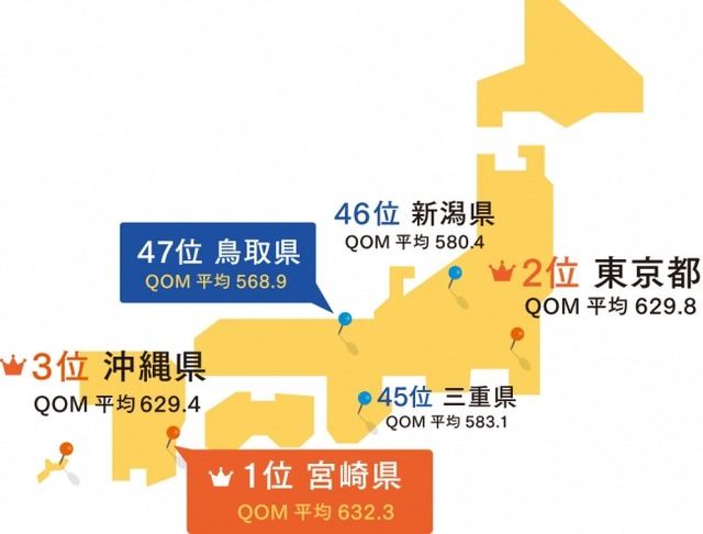 1位は「宮崎県」(QOM平均632.3)で、昨年度の2位からトップ返り咲きました。さらに3位「沖縄県」(同629.4)、4位「鹿児島県」(同627.8)、6位「福岡県」(同617.4)、9位「熊本県」(同613.5)と、九州・沖縄エリアの都道府県が上位に多くランクインしています。