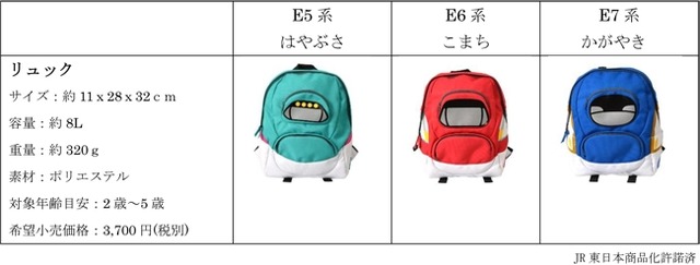 人気の「E5系はやぶさ」「E6系こまち」「E7系かがやき」の3種類の新幹線の顔をモチーフに、デザインにこだわり制作しました。丈夫で軽いポリエステル素材を使用し、背面はクッション性・通気性のあるエアメッシュ加工を施しました。