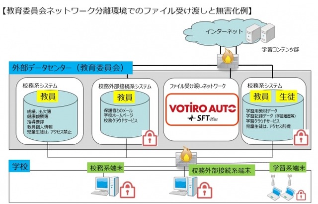 「Votiro Auto SFT Plus」は、株式会社NSDビジネスイノベーションが開発したエンタープライズ向けのセキュアなファイル受け渡しシステムである「eTransporter」の技術をベースに、文部科学省が2017年10月18日に策定した教育情報セキュリティポリシーに関するガイドラインに準拠した教育委員会向けのネットワーク分離環境専用にカスタマイズしたモデルです。