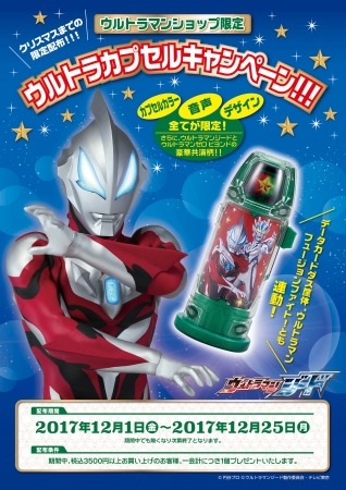 対象店舗にて税込3,500円以上お買い上げのお客様、1会計につき1個、ウルトラマンショップ限定のウルトラカプセルをプレゼント。「ウルトラマンジード プリミティブ」と「ウルトラマンゼロ ビヨンド」が豪華共演した限定柄を使用しています。カプセルカラーはクリスマスカラーのグリーン。音声はクリスマスにぴったりのメッセージが入っています。「データカードダス ウルトラマン フュージョンファイト!」筐体とも連動いたします。
