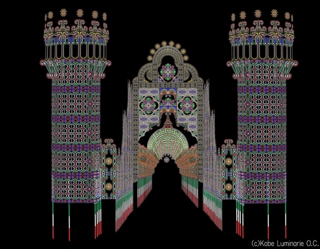 神戸ルミナリエは、1995年1月に兵庫県南部地方を襲った阪神・淡路大震災の犠牲者への鎮魂の意を込めるとともに、神戸の街の復興・再生への夢と希望を託して、この年の12月に初めて開催され、今年で第23回目を迎えます。神戸ルミナリエの作品は、毎年、その年のテーマに沿ってデザインし、このデサインに合わせた部材をイタリアから運んで、イタリア人職人と日本人スタッフの手によって組み立てています。直線道路上に配置する光の回廊「ガレリア」、その終点の広場に展開する光の壁掛け「スパッリエーラ」などで構成されています。