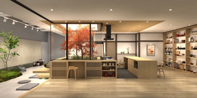 「旬にあふれる、ぜいたくな時間をわが家で」は、料理研究家の大原千鶴さん(※)のくらしへの想いをパナソニックが形にしたキッチンダイニングです。「料理を楽しめる人は、人生を楽しめる力がつく」と語る大原さんは、どんなに忙しくても自然に触れる時間は必要不可欠であり、自分が1日の大半をすごす場所として、ほっこりできるキッチンを理想としています。それに応えるため、部屋の中まで入り込んだガラス張りの中庭を「風庭(かぜにわ)」と名付け、キッチンカウンターと一体化して四季を映す小さな自然を身近に配置。料理がいちばん美味しい「炊きたて」「焼きたて」を段取りよく揃えられるように、動線やレイアウトにもこだわりました。庭を眺めながら料理をつくり、自然を愛でながら家族で食事を楽しむ、大原流の「ぜいたくな空間」を体験できます。