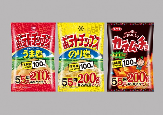 株式会社湖池屋(本社:東京都板橋区/社長:佐藤章)は、1962年の発売より「湖池屋ポテトチップス」シリーズが2017年で55周年を迎えることを記念し、長年のご愛顧に対する感謝の気持ちを表現した「湖池屋ポテトチップス」55周年記念商品として、「湖池屋ポテトチップス のり塩」、「湖池屋ポテトチップス うま塩」、「カラムーチョチップス ホットチリ味」の3商品において大容量の“55周年ありがとうサイズ”を2017年11月13日(月)~2018年1月13日(土)の期間限定で、全国・全チャネルにて発売いたします。