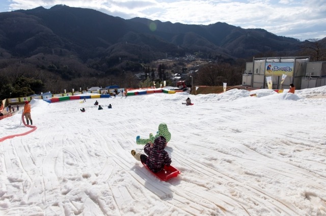 「スノーパラダイス」は関東最大級(面積約6,000m2 )の雪遊びゲレンデで、新宿から1時間の相模湖の森にあり、子どもたちが自然の中で思いっきり雪と遊べる施設です。特に眼下に広がる山々に向かって全長50mもの斜面をそりでダイナミックに滑り降りる爽快感は格別です。