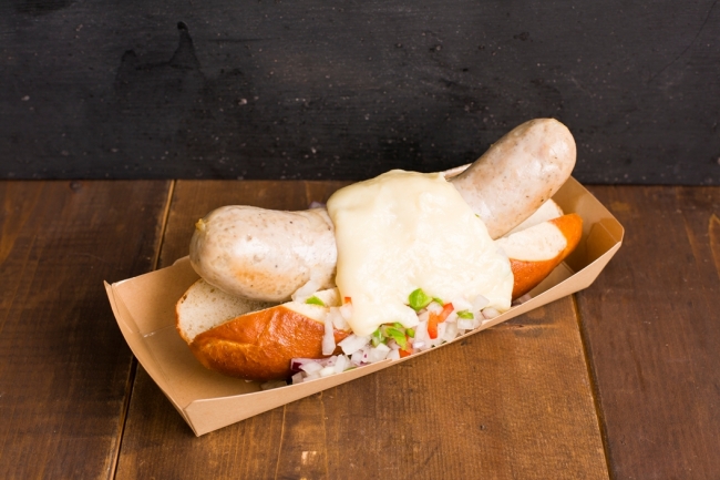 柔らかくてほんのり甘いプレッツェルパンに、太くてジューシーな白いソーセージを大胆に挟んだホットドッグ!とろとろのチーズを上からたっぷりとかけてあるので、ガブっとほおばるとチーズとソーセージのハーモニーが口の中に広がります。