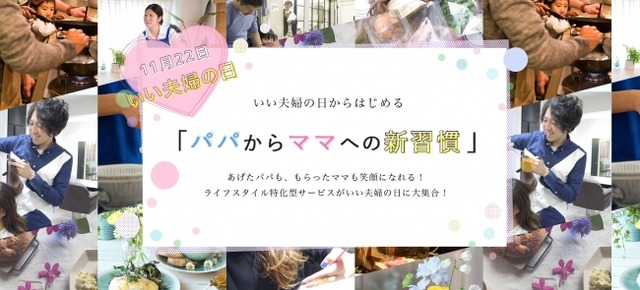 株式会社Crunch Style(本社:東京都渋谷区、代表取締役:武井亮太)、株式会社CaSy(本社:東京都千代田区、代表取締役CEO:加茂雄一)、株式会社アースホールディングス(本社:東京都渋谷区、代表取締役社長:國分利治)、株式会社ブレンド(本社:東京都目黒区、代表取締役:田尾秀一)、特定非営利活動法人スーパーダディ協会(理事長:高橋一晃)は、ママが喜ぶ「パパからママへの新習慣」を提唱しています。新習慣のきっかけ作りのために、いい夫婦の日の11月22日から、4つのサービスをお得に使えるキャンペーンもスタートいたします。
