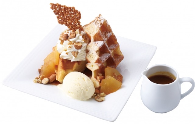 ラム酒とシナモンが香るりんごのコンポートと相性のよいキャラメルソースで仕上げた期間限定ワッフルです。風味のよいりんごとコクのあるキャメルソースが重なり、甘く香ばしい味わいをお楽しみ頂けます。別添えのあたたかいキャラメルソースをかけてお召し上がりください。