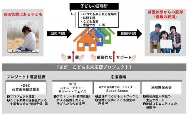 公益財団法人佐賀未来創造基金がプロジェクト運営を務め、支援者拡大や情報発信などを行います。認定特定非営利活動法人NPOスチューデント・サポート・フェイスが訪問支援(アウトリーチ)、特定非営利活動法人さが市民活動サポートセンター、特定非営利活動法人Succa Sencaが居場所同士のネットワークづくりや居場所への食材提供やボランティアの調整などを、認定特定非営利活動法人地球市民の会が在住外国人家庭の生活サポートなどを行います。今後、支援の輪を広げることで、より多面的な支援活動を展開する予定です。
