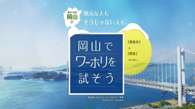 岡山県では、岡山県外に在住する若者(大学生等)を対象に、岡山県内各地で2週間から1カ月程度、働きながら田舎暮らしの良さを知っていただく「岡山県ふるさとワーキングホリデー」を実施しており、この度、春休み期間に参加する大学生等を募集します。