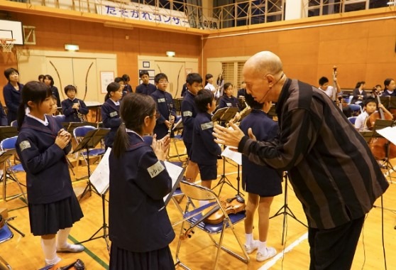 小豆島を訪れるのは初めて、小学生だけのオーケストラを教えるのも初めて、という井上道義氏。