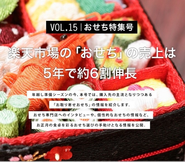 年越し準備シーズンの今、本号では、購入先の主流となりつつある「お取り寄せおせち」の情報を紹介します。具体的には、楽天市場におけるランキング情報のほか、1位のおせちを製造・販売しているおせち専門店へのインタビューや、個性的なおせちの情報を掲載しており、お正月の食卓を彩るおせち選びの手助けとなる情報を公開しています。