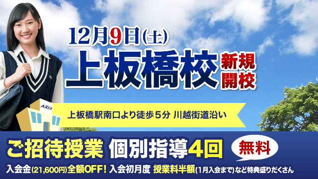 開校を記念し、特典をご用意しました。見学・学習相談は、いつでも承っておりますので、ぜひこの機会に「個別指導Axis上板橋校」をご利用ください。